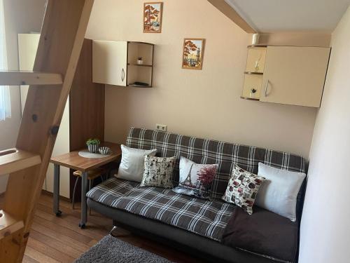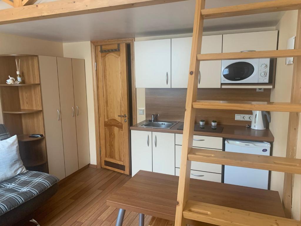 Siūlome Jums patogų poilsį vieno kambario mini butukuose, kurie yra skirti penkiems asmenims poilsiauti. Visi mini butukai yra pirmame aukšte, pačiame Juodkrantės centre renovuotame Neringos senos architektūros name, ramioje vietoje Kalno gatvėje (netoli pagrindinio kelio vedančio prie jūros).